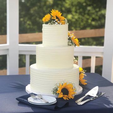 Sunflower Themed Wedding. Sunflower Wedding Cake Three tier white wedding cake with buttercream icing and sunflowers. 3 Tier Birch Wood Rustic Sunflowers Sunflower Wedding Cake.
